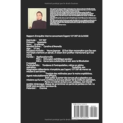 Rapport d'enquête interne concernant l'agent 127 207 de la DGSEMatricule : 127 207Prénom : AnastasiaNom : A rallongeIdentité fictive : Carolina D'AronellaAge : 27 ansSituation maritale : Veuve joyeuse (il faut bien reconnaitre que feu son mari était un abruti)Famille : Dysfonctionnelle Père : Chirurgien plastique cavaleur Mère : Garce sans culotte (rien à voir avec la Révolution Française)Particularités : Tendance à l'extrapolation, même en pleine opération. Toutefois, son imagination débordante n'empêche pas l'agent 127 207 de mener sa mission à son terme. Emploie des méthodes pour le moins expéditives. Agent redoutablement efficace. Doit veiller à porter des tenues plus adaptées aux missions qui lui sont confiées et à ne pas abuser de la vodka en opération. Porte un intérêt certain à son collègue. Cet intérêt semble réciproque. Risque de se terminer en partie de jambes en l'air. La DGSE doit surveiller ces deux-là.Potentiel : EnormeUN PETIT MOT SUR VOTRE SERVITEURJ'ai passé les vingt premières années de ma vie au Havre au sein d'une famille aimante. Mes parents n'ont jamais divorcé, pas même une toute petite fois de rien du tout en cinquante-deux ans de mariage. Mon père n'a jamais été un chirurgien esthétique à la libido exacerbée ; ma mère n'a jamais jeté sa culotte en l'air. Pour ce que j'en sais en tout cas.Après de nombreuses années de danse classique et quelques autres à étudier la géographie, je me suis installée à Paris avec mon mari qui, à ma connaissance, n'a jamais sauté une seule de mes copines, mais comme tout un chacun le sait, c'est toujours le cocu le dernier informé. C'est sans doute la raison de la longévité de notre couple : la fidélité, pas l'adultère.J'ai deux fils que j'adore, ce qui ne m'empêche pas d'avoir hâte que l'adolescence se termine.Je ne me mets à ma table d'écriture qu'après être allée boire une noisette au café en bas de chez moi avec quelques amis. Il est généralement 9 heures, parfois un peu plus tard car il m'arrive d'être un peu pipelette. Disons 10 heures, rarement 11, je sais être raisonnable. Je ne parviens à écrire que lorsque mon mari est parti à son travail et que mes enfants sont en classe. Quand la maison est calme, qu'il n'y a plus un bruit, qu'on entend plus "il est où mon tee-shirt ? Qu'est-ce qu'on mange ? C'est de sa faute. Je vais le dire à maman. J'ai pas envie de faire mes devoirs. Meuh, t'es pas cool !" Vous voyez ce que je veux dire ?Lorsque je ne suis pas à Paris, j'adore écrire dans un jardin du Gâtinais, à l'ombre d'un tilleul centenaire. Mon unique voisin, l'âne Martin acquiesce à toutes les bêtises que j'invente. C'est parfait, des bêtises j'en invente plein et j'adore avoir raison. Lui et moi sommes faits pour nous entendre. Ce livre est mon premier roman. Si vous avez pris autant de plaisir à le lire que j'en ai eu à l'écrire, alors surtout, surtout ! dites-le autour de vous et laissez un commentaire et il se pourrait ainsi qu'il ne soit pas le dernier. J'ai encore tout plein de bêtises à vous raconter.Si vous souhaitez m'envoyer un gentil petit message, ma boite mail vous est grande ouverte. elsacosqueric05@gmail.com Je me ferai une joie de vous répondre. Vous pouvez aussi passer me dire bonjour sur mon compte Instagram : elsacosqueric05Elsa Cosquéric.P.S. Dans la vraie vie, je suis agent secret. Chut ! Ceci est une information classée secret Défense.